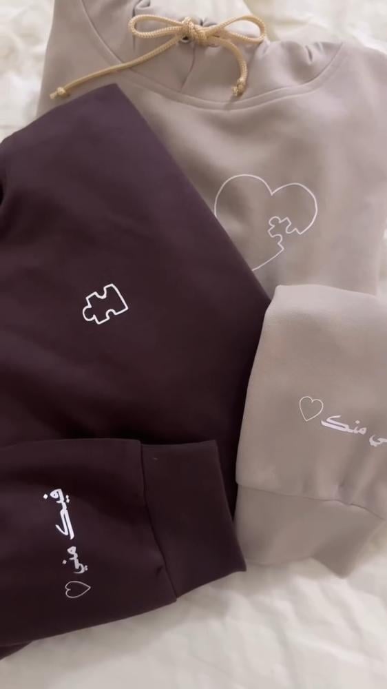 يمكنك اختيار النص الجاهز "فيني منك" أو "فيك مني" ليعبر عن علاقتك الخاصة، أو كتابة نص مخصص يعبر عن مشاعرك بأسلوبك الخاص. بالإضافة إلى ذلك، أضف لمسة فاخرة برسالة جانبية مخصصة على الكمّ لتجعل الهودي أكثر تميزًا وتفردًا.